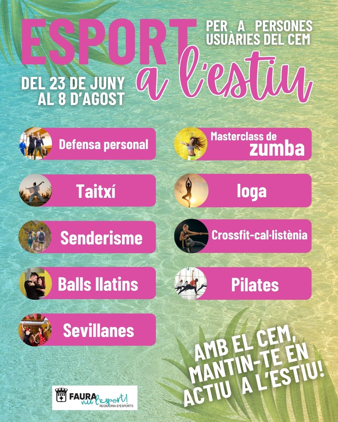 La programació d’enguany inclou nou activitats: taitxí, balls llatins, sevillanes, ioga, crossfit-cal·listènia, pilates, senderisme, masterclass de zumba i defensa personal. Aquestes activitats, pensades per a tots els gustos, es desenvoluparan en diferents espais municipals com el pavelló, la piscina i zones obertes, aprofitant el bon oratge per promoure un estil de vida actiu.