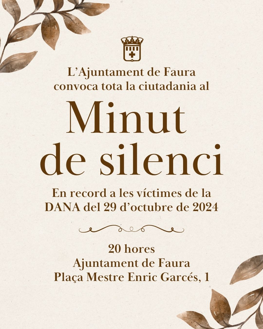 L’Ajuntament de Faura convoca tota la ciutadania a guardar un minut de silenci demà, 29 d’octubre de 2025, en record i memòria de les víctimes de la DANA, quan es complix un any de la tragèdia.