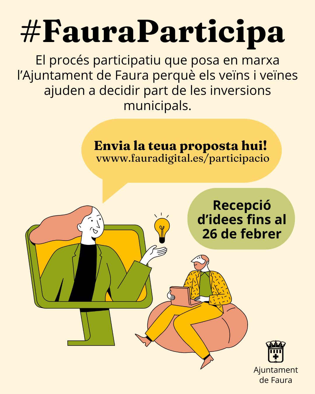L’Ajuntament de Faura posa en marxa una nova edició dels pressupostos participatius, un procés obert a tota la ciutadania per a arreplegar propostes que ajuden a millorar el nostre poble. Per enviar la teua idea, únicament has d'omplir el formulari que trobaràs a https://fauradigital.es/participacio.