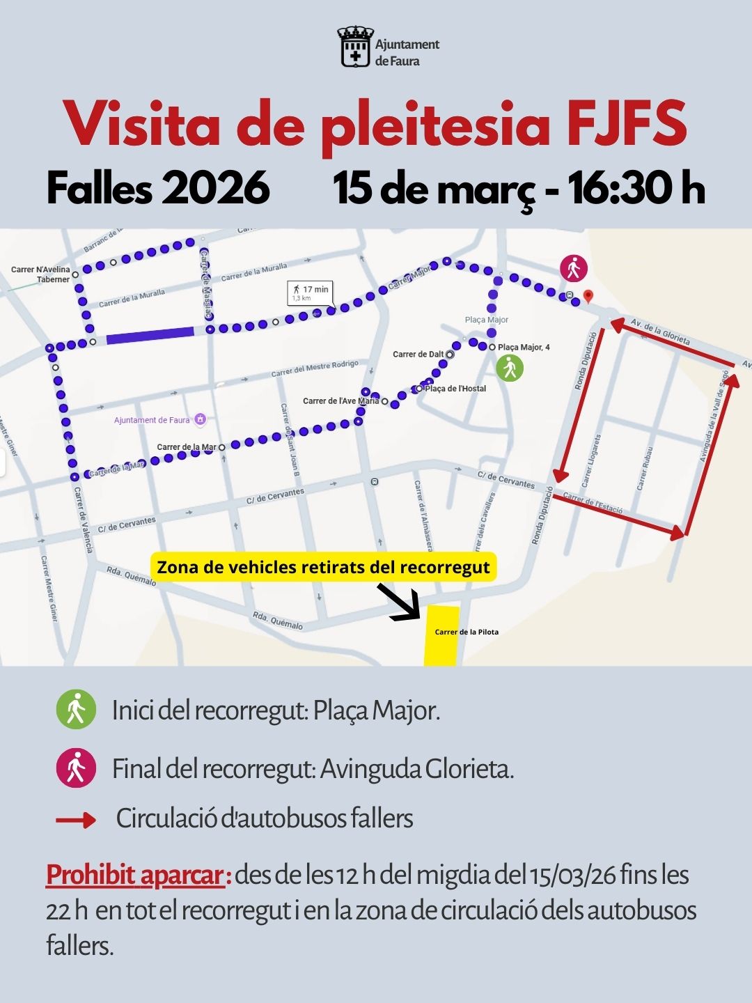 Vehicles retirats: Si el vostre cotxe es troba en el recorregut, serà reubicat en l'esplanada del parc al costat del carrer de la Pilota. Recomanem retirar-los amb antelació per evitar molèsties.
