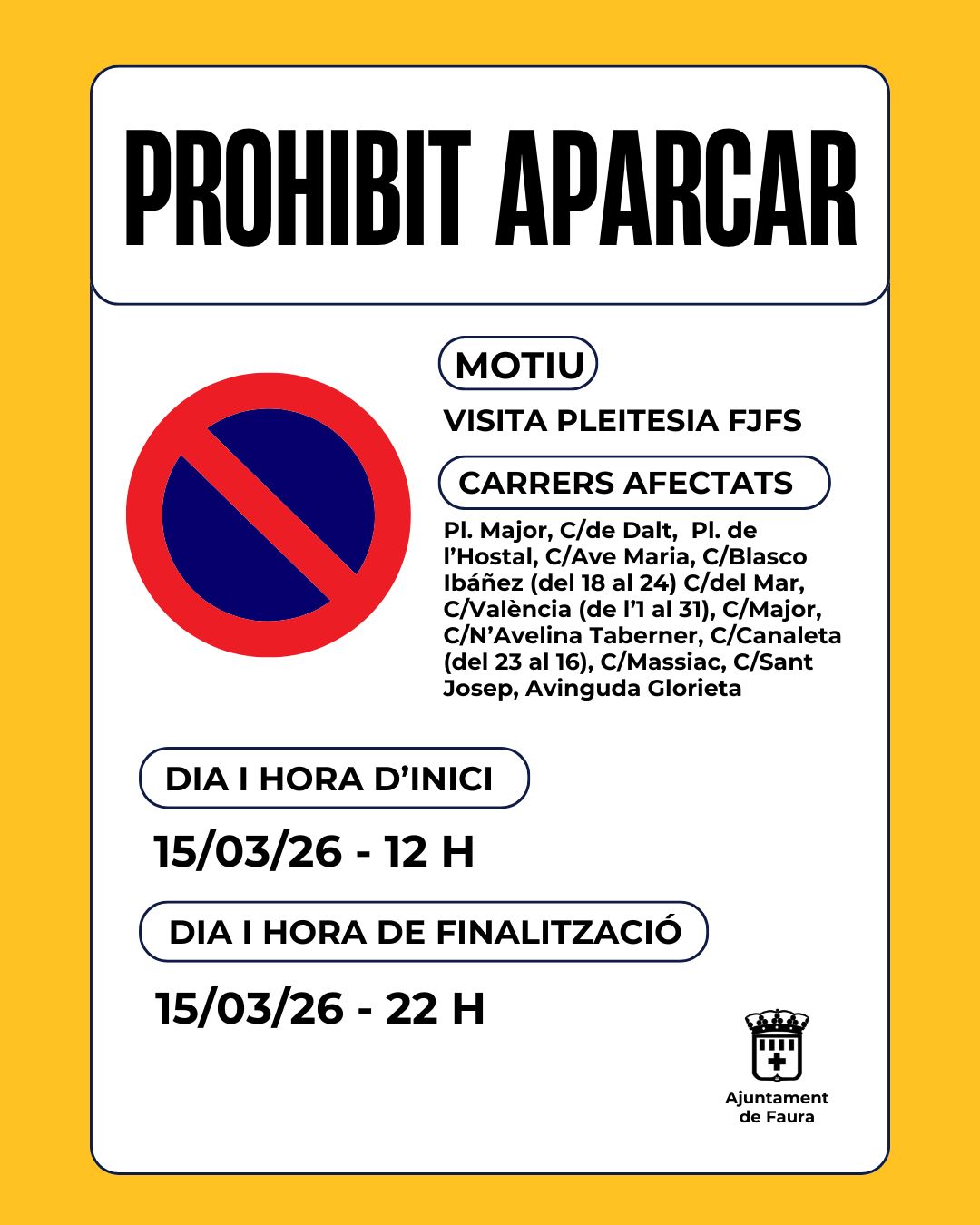 Prohibit aparcar: Des de les 12:00 h del migdia fins a les 22:00 h en tot el recorregut i en la zona de circulació dels autobusos fallers (Ronda Diputació, Carrer de l'Estació i avinguda de La Vall de Segó).